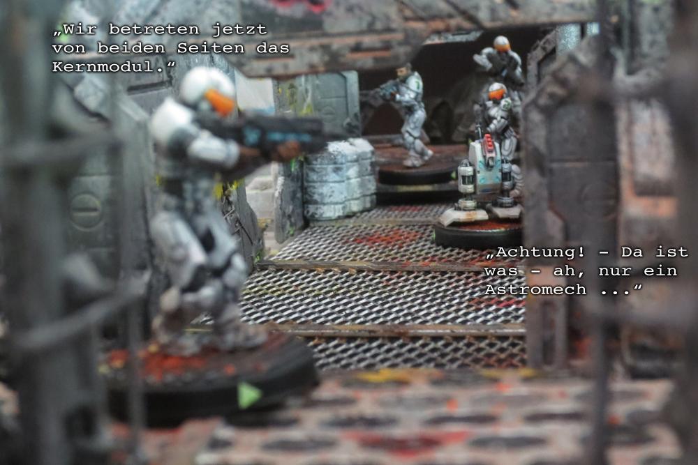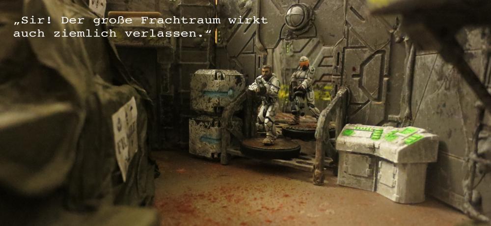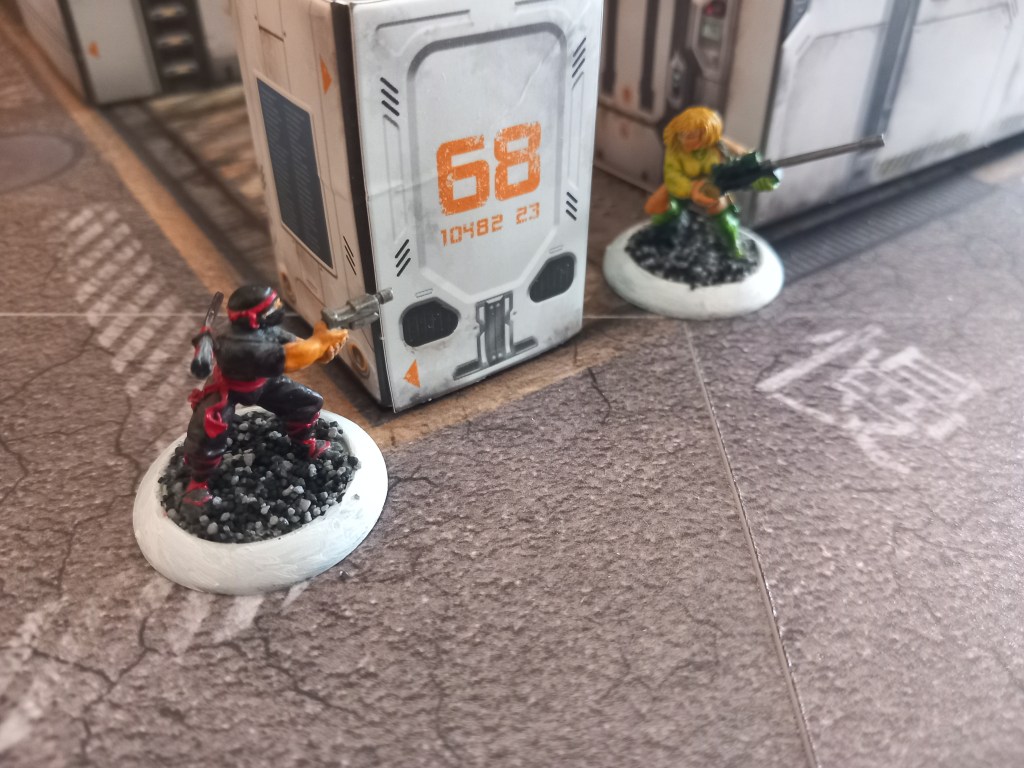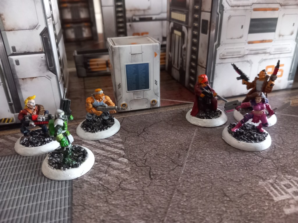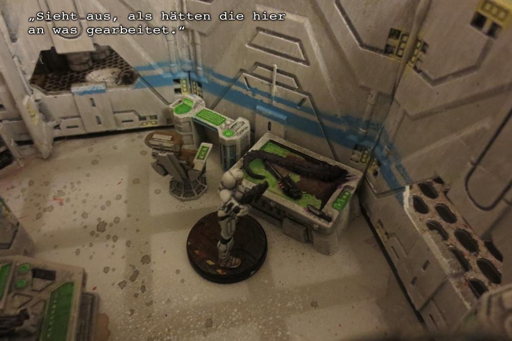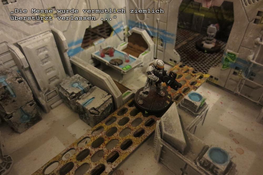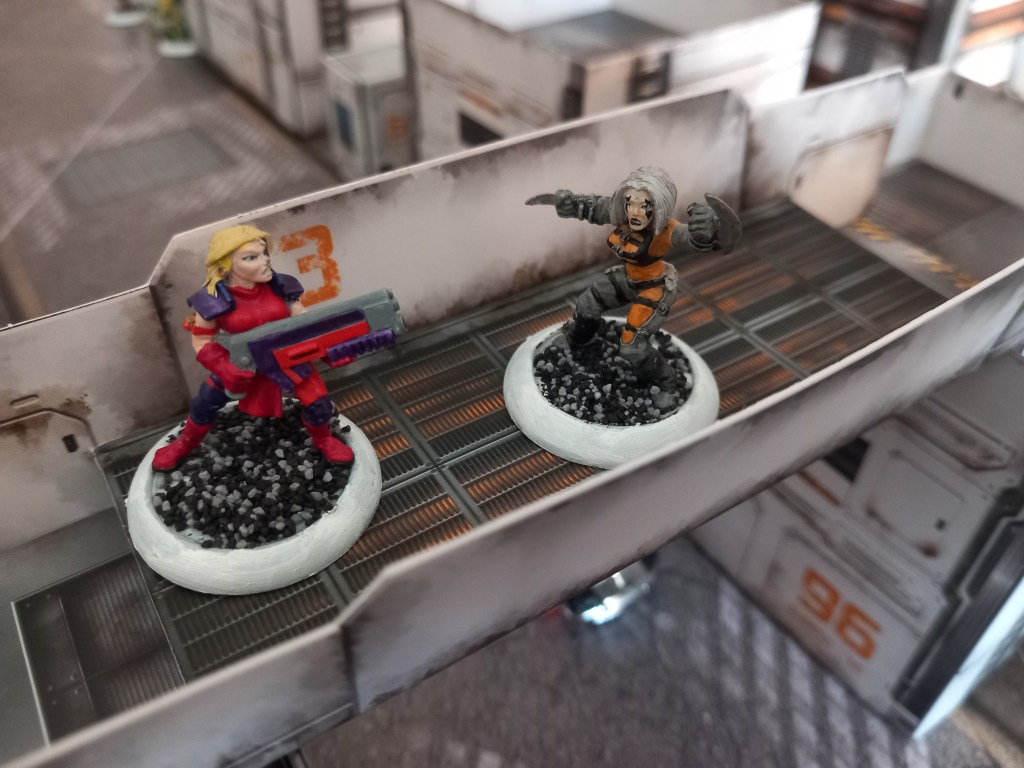Wir spielen auf zwei kleinen Flächen und stellen einmal einen DeepSpace-Einsatz im klassischen SciFi-Setting und einmal eine CyberPunk-Variante vor. In beiden Missionen geht es darum, eine entführte Zielperson zu „extrahieren“