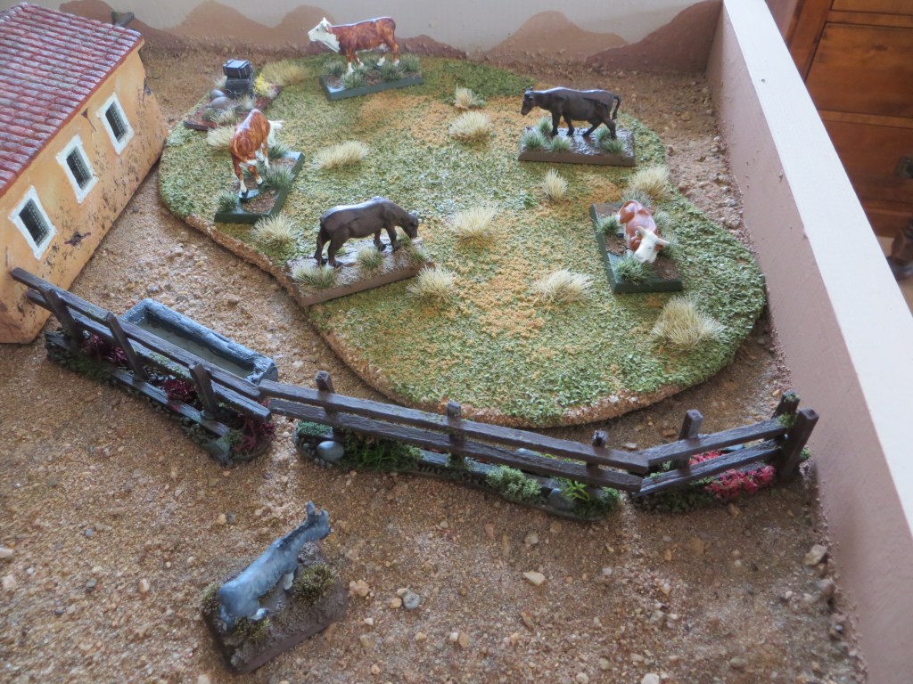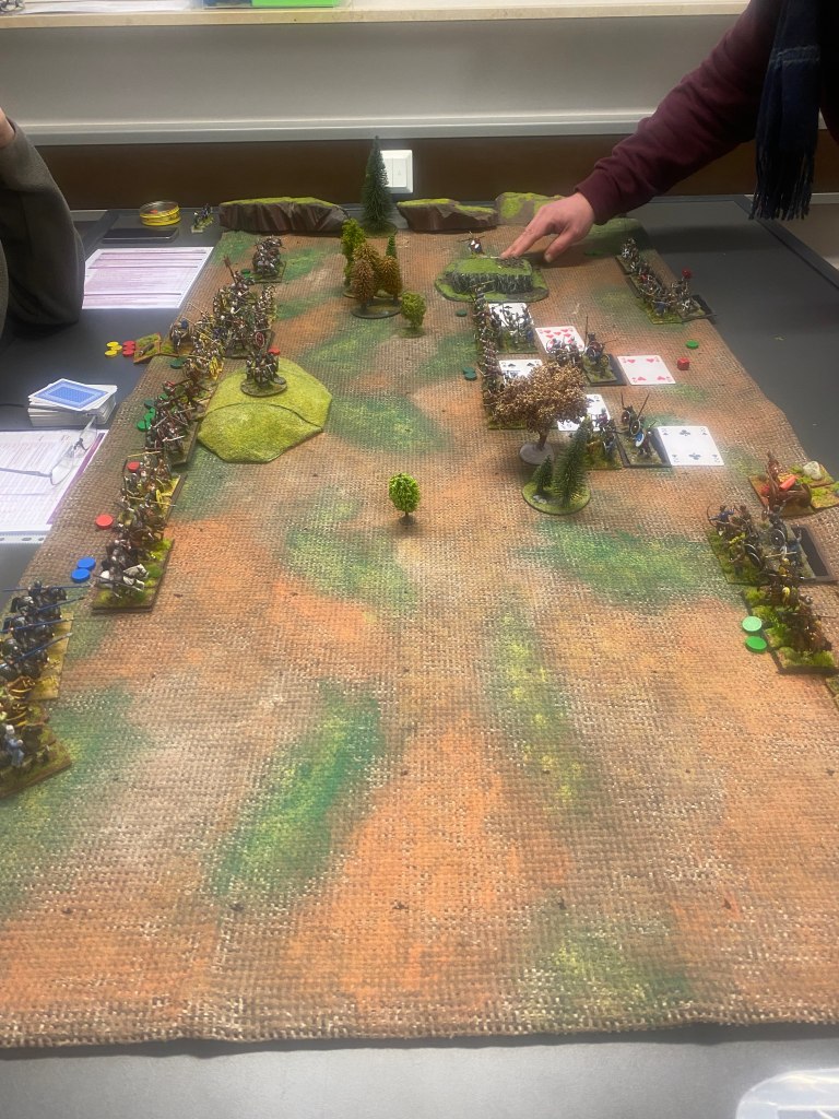 Ohne Maßbänder und Würfel. Zum aktivieren und kämpfen werden 2 Skatkartenspiele benutzt. Wir spielen im 28mm Maßstab.